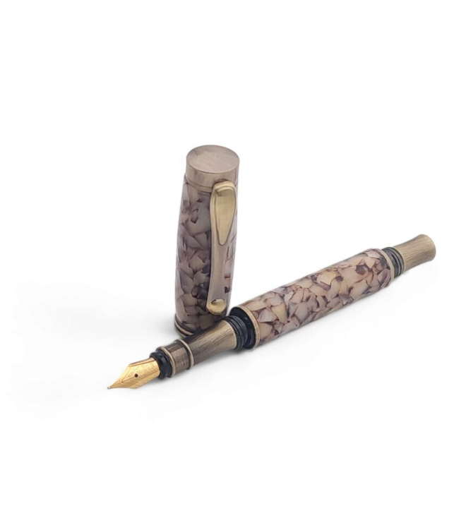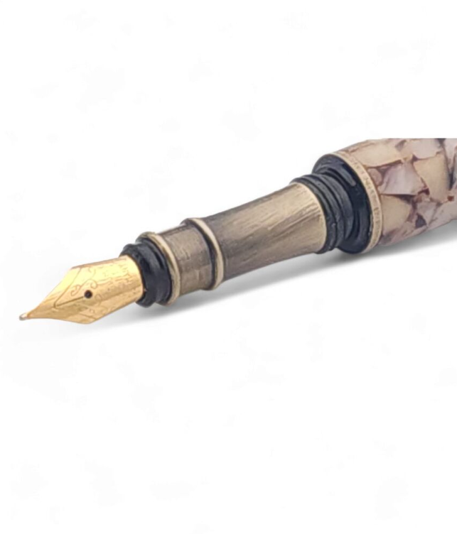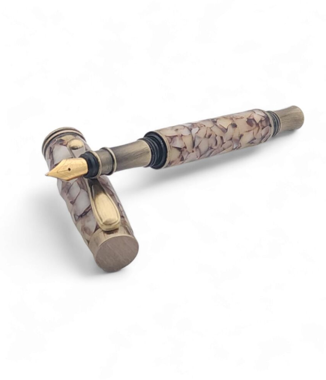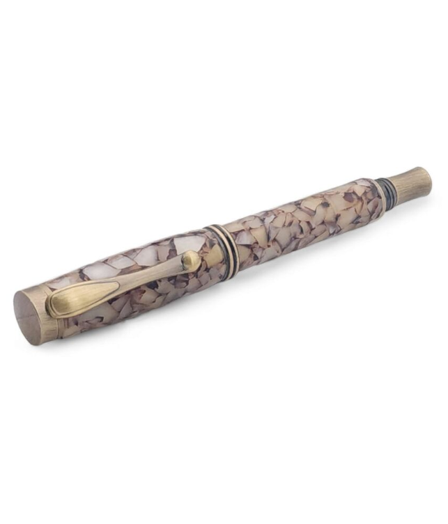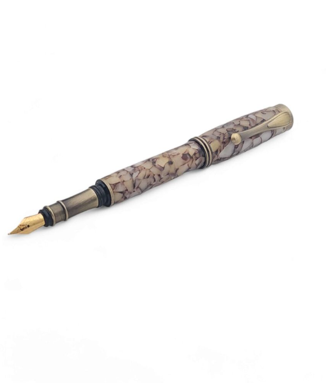 עט נובע ייחודי בעבודת יד, המשלב את הקסם של פעם עם הדיוק של היום. גוף העט עטוף בגימור פסיפס פנינתי בגוונים חומים-ורדרדים, שמזכירים קונכיות עתיקות או קירות שיש מפוארים.