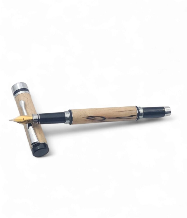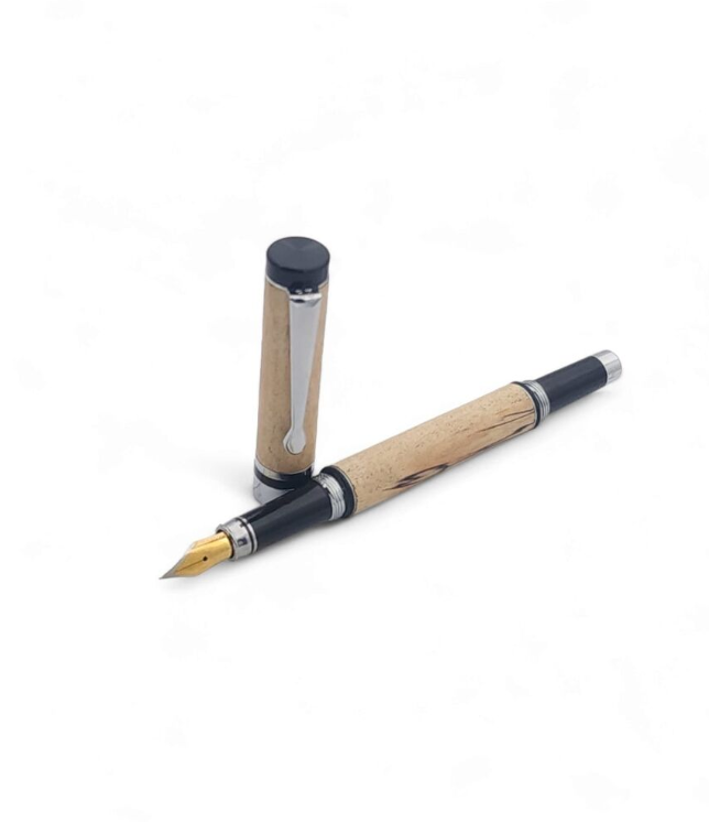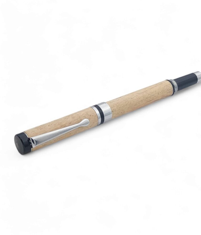 עט נובע בעבודת יד עם גוף עץ בגוון בהיר ומרקם טבעי, מחוזק בגימורים כרומיים שמוסיפים לו קלאסה עכשווית, מבלי לגנוב את הבמה מהחומר עצמו.